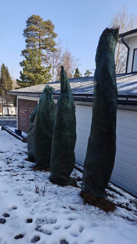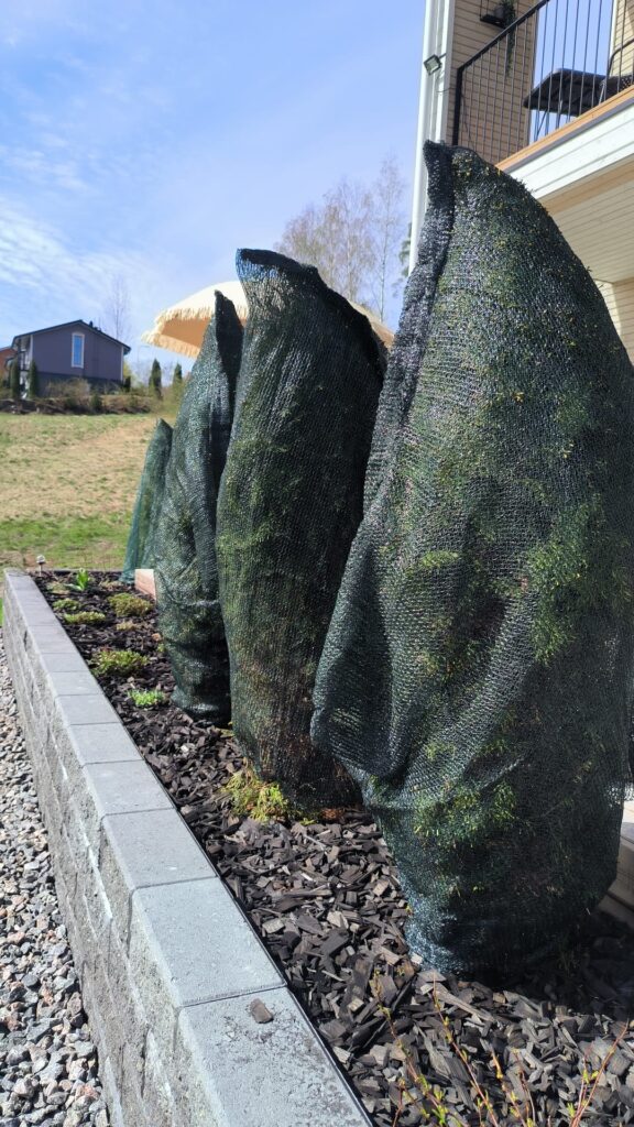 Havukasvit kannattaa suojata pakkaspeitteellä tai säkkikankaalla kevätahavan välttämiseksi.